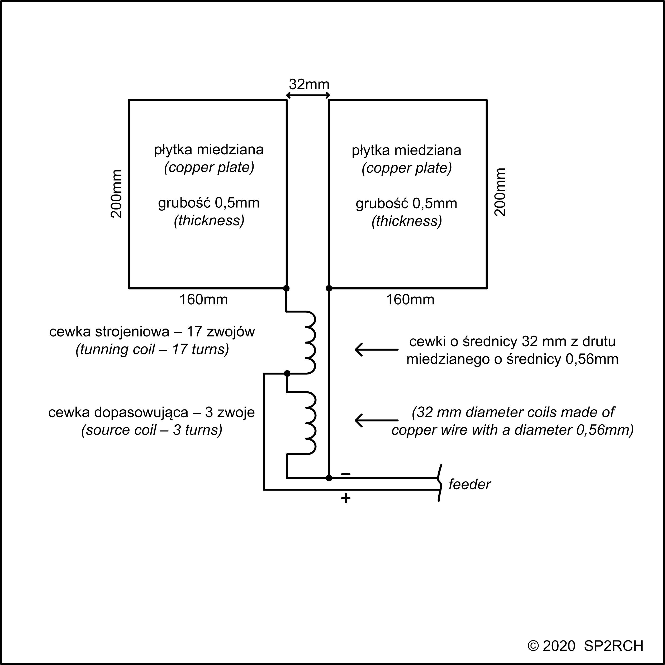 Antena została zbudowana z dwóch płyt miedzianych o wymiarach 160mm x 200mm. Grubość każdej płytki to 0,5mm. Odległość między płytami miedzianymi wynosiła 32mm. Jest to również średnica cewek strojeniowej oraz dopasowującej. Obie cewki zostały wykonane z drutu miedzianego w izolacji z tworzywa sztucznego. Drut miał średnicę 0,56mm. Cewki zostały nawinięte na rurę z tworzywa sztucznego o średnicy zewnętrznej 32mm. Cewka strojeniowa posiadała około 17 zwojów, cewka dopasowujaca posiadała około 3 zwoje. Schematyczny rysunek przedstawiający konstrukcję anteny EH wykonanej przeze mnie znajduje się poniżej.