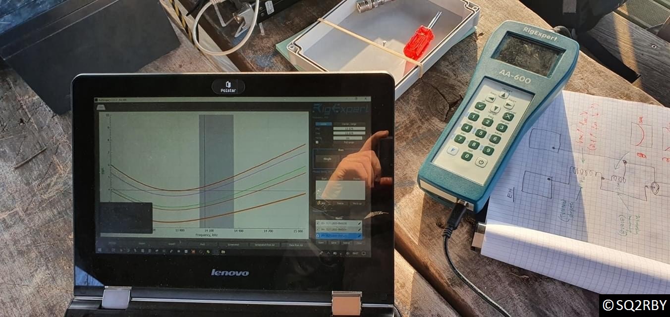 Opracowania Teda W5QJR oraz Vladimira UA1ACO podają, iż do strojenia wymagany jest miernik natężenia pola. Wskazania miernika pola którym dysponowałem uznałem za zbyt mało precyzyjne by dobrze zestroić antenę EH. Swoją konstrukcję zestroiłem śledząc kształt charakterystyki SWR, fazy oraz obserwując poziom składowych impedancji.
