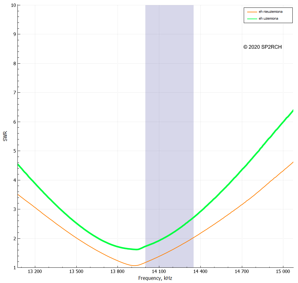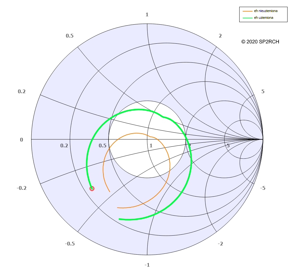 W prosty sposób zbadałem jak uziemienie anteny EH wpływa na jej paramtery. Przedstawione poniżej wykresy dotyczą anteny EH uziemionej (kolor zielony) i nieuziemionej (kolor brązowy). Jest to prosty test który każdy może wykonać samodzielnie. Punktem styku ziemi i anteny EH w moim przypadku było gniazdo UC-1 łączące antenę z fiderem.
