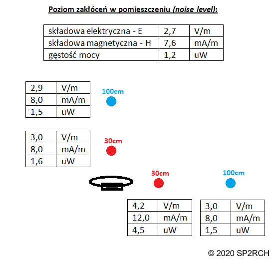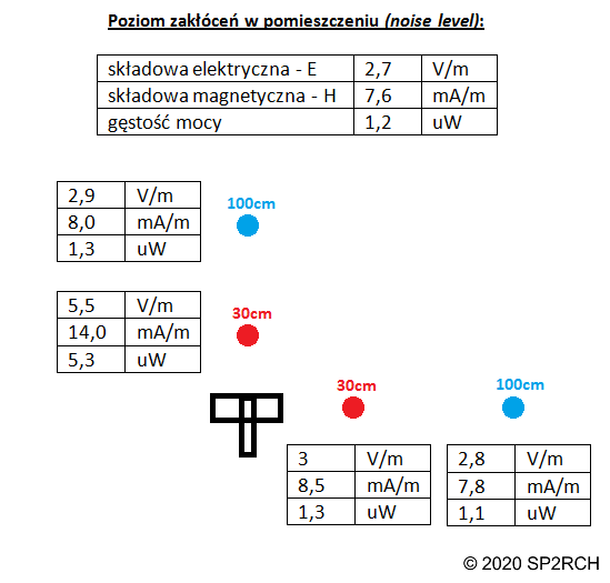 Zaprezentowane w sposób schematyczny wyniki stanowią odczyt z miernika pola (bez odejmowania poziomu otoczenia).