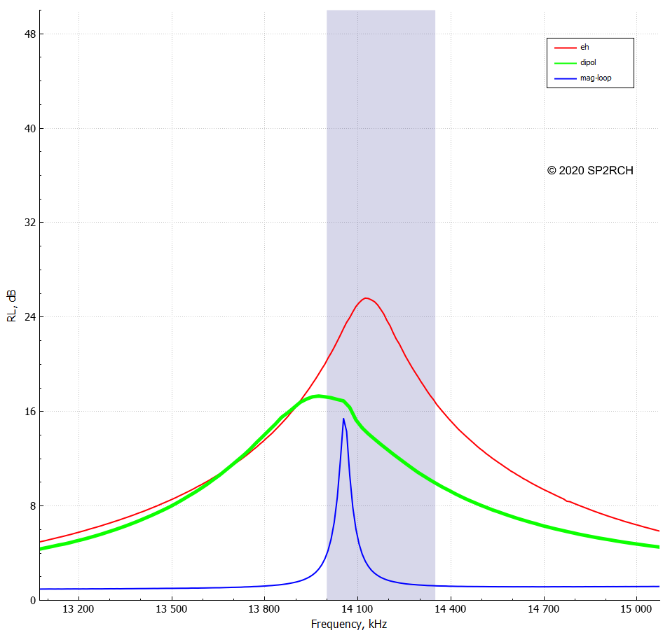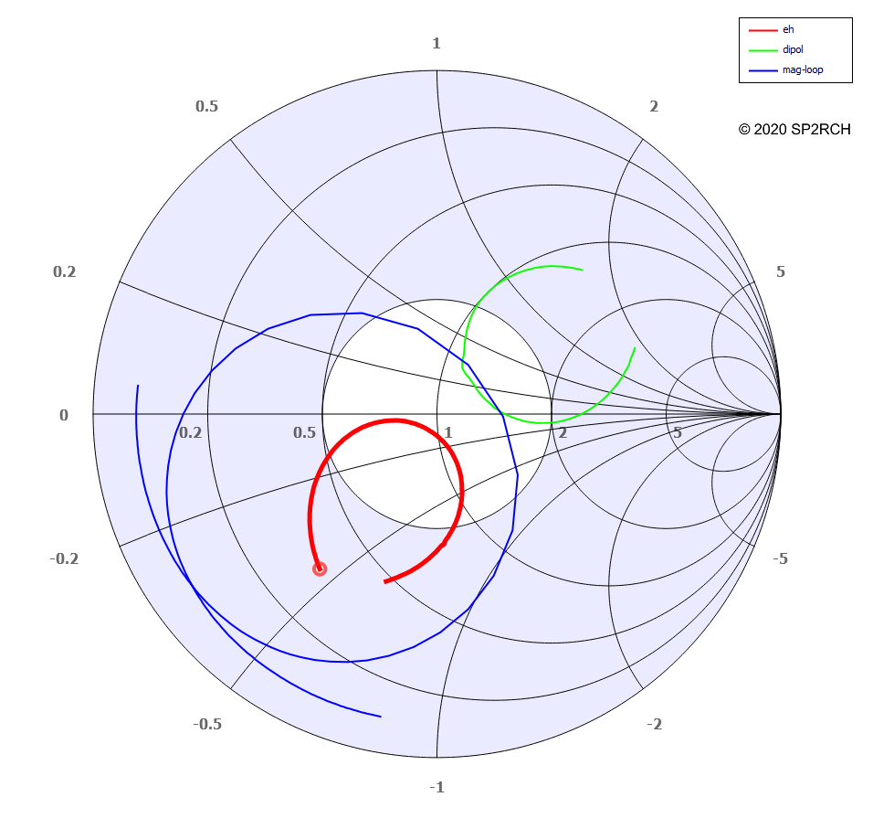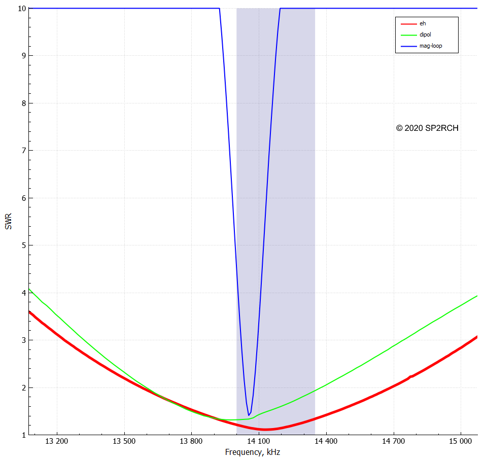 Antena EH pomimo wielokrotnie mniejszych wymiarów cechuje się kształtem charakterystyki współczynnika fali stojącej (SWR) zbliżonym do dipola.