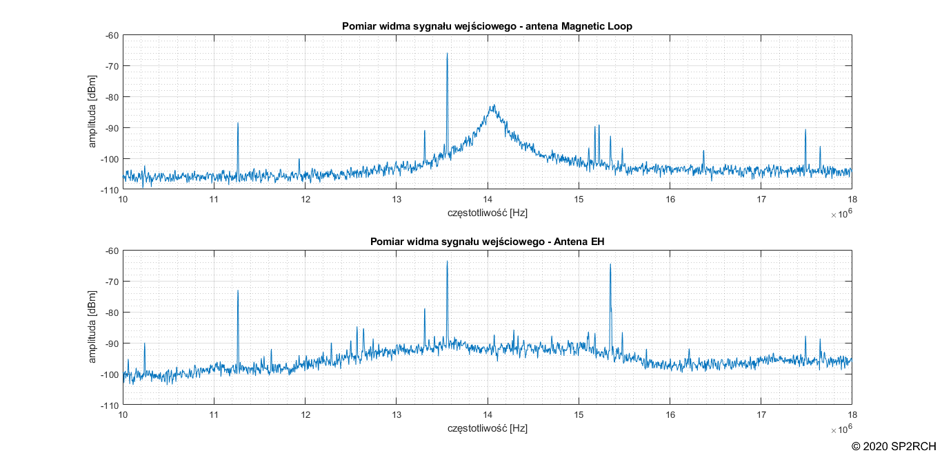 Pomiar polegał na podłączeniu badanej anteny i wykreśleniu charakterystyki amplitudy odbieranego sygnału w funkcji częstotliwości. Zakres badanej częstotliwości celowo obejmował o wiele większe pasmo. Zmierzony został poziom sygnałów odbieranych w zakresie od 10MHz do 18MHz. Tym samym przewidziane pasmo pracy anten mieściło się mniej więcej po środku tego przedziału. Antena pętlowa cechuje się o wiele większą selektywnością. Z kolei antena EH lepiej odbiera sygnały w całym pasmie, można to zaobserwować np. przy częstotliwości ok. 11,260MHz oraz 15,350 MHz.