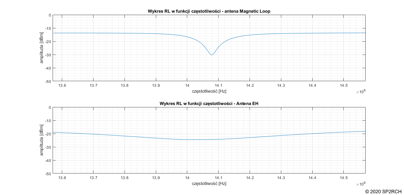 Wykres strat odbiciowych co do kształtu pokrywa się z pomiarami urządzeniem RigExpert. Antena Magnetic-Loop stoi się o wiele ostrzej w porównaniu z anteną EH. Pomiar analizatorem Rigol był jednak zdecydowanie dokładniejszy z uwagi na większą liczbę próbek i mniejszy zakres częstotliwości pomiaru w porównaniu z pomiarem w wolnej przestrzeni. Dzięki temu widać dokładnie przewagę anteny Magnetic-Loop. Jej zdecydowanie większa selektywność pozwala na większe tłumienie niepożądanych sygnałów. Istnieje możliwość matematycznego przeliczenia wartości RL na SWR. W przypadku RL na poziomie 30dBm przeliczony SWR osiąga wartości poniżej 1,1.