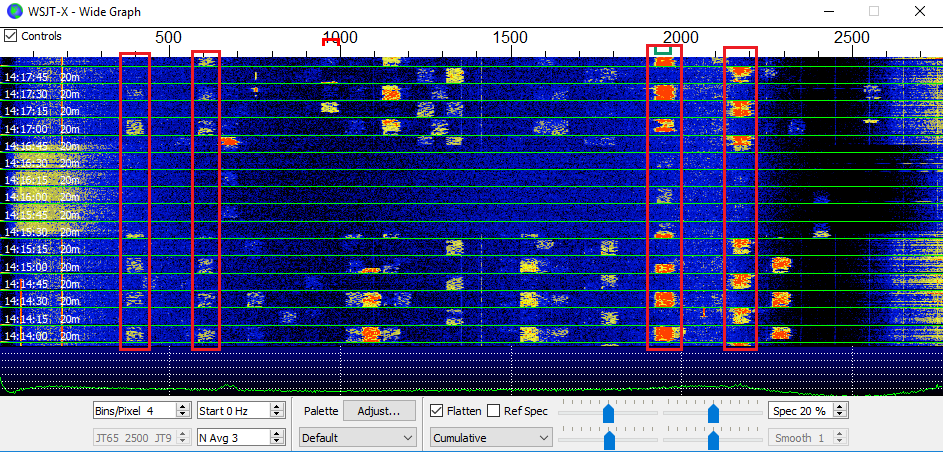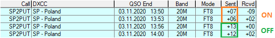 W warunkach domowych zauważyłem duży wpływ zakłóceń z sieci elektroenergetycznej. Przyczyną zakłóceń był w moim przypadku zasilacz impulsowy służący do zasilania laptopa (nie tego który był podłączony do radia, innego ale podłączonego do tej samej sieci). W przypadku podłączenia tego zasilacza do sieci znacznie wzrastał poziom szumu. Mocne sygnały odbierane przy wyłączonym zasilaczu impulsowym stawały się kilkukrotnie słabsze a sygnały słabe zanikały zupełnie. Zjawisko zostało zobrazowane na rysunkach poniżej. Sygnały po włączeniu zasilacza dekodowane były z różnicą w odstępie sygnału od szumu na poziomie 6 db co równoznaczne jest z 4-krotnym spadkiem mocy sygnału.